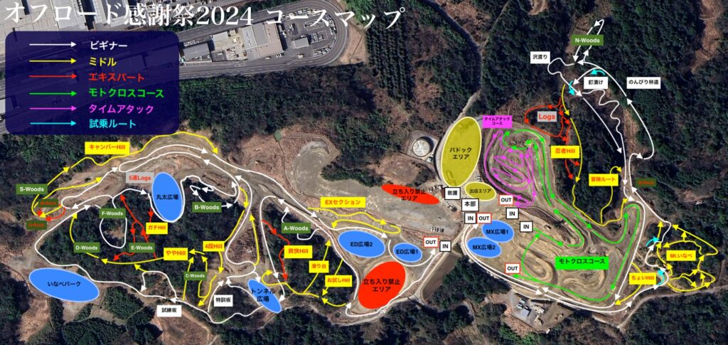 いなべモータースポーツランド全面貸切による特設コースです。写真は2024年のコースマップですが、今年は少し開拓してスケールアップする予定です!