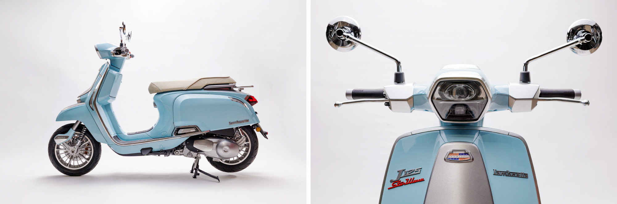 このほど用意される新しい“J”は、デザイン・アイコンはもちろん1964年当時の“J”に範をとり、車両のすべてのラインが当時をほうふつとさせるよう丁寧に作りこまれている。台形の長いサイドパネル、六角形のヘッドライト、前後に長く、スリムなシートはまさにランブレッタならではのスタイルであり、ファミリーの末弟となる”J”にも『一見してランブレッタとわかる』よう色濃く反映されている。メタル・ボディとリーディング・アーム式のダブル・フロントショックはオーセンティックなランブレッタらしいハンドリングの実現にも大いに寄与しているのだ。